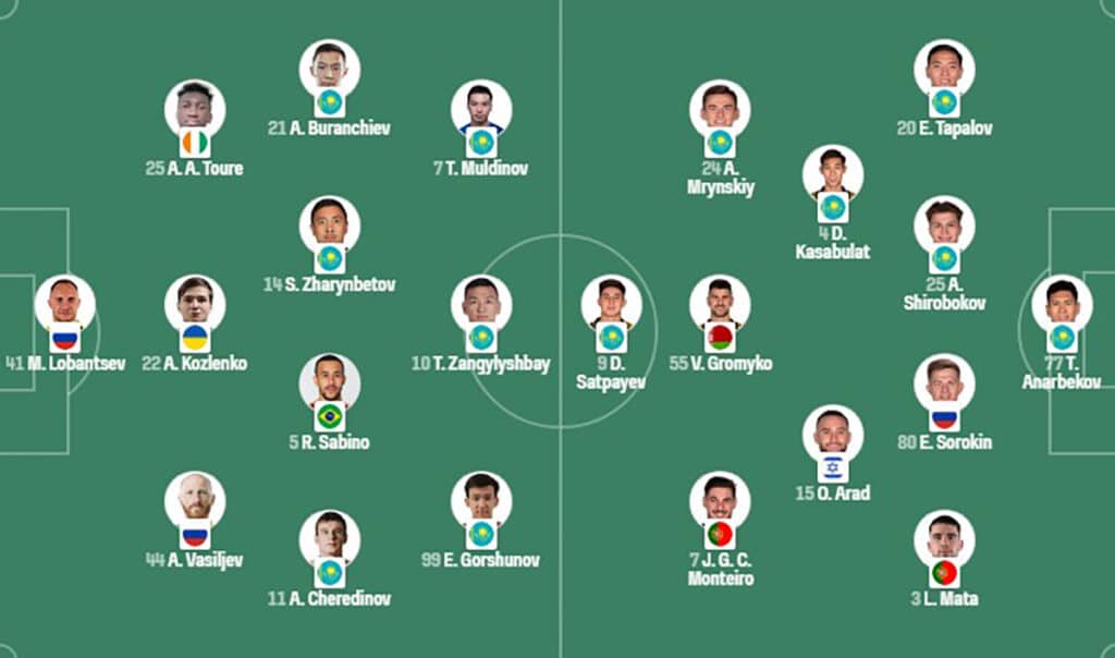 Рафаэль Уразбахтин выставил практически боевой состав. В запасе остался лишь Александр Мартынович. Привычное место в воротах вместо 18-летнего Шерхана Калмурзы, сыгравшего со «Спортингом» и «Реала», занял Темирлан Анарбеков. 22-летний голкипер, восстановившийся после перелома челюсти, на 17-й минуте спас свою команду от неминуемого гола после удара в упор Токтара Жангылышбая.