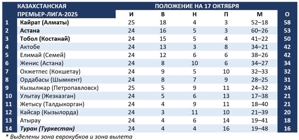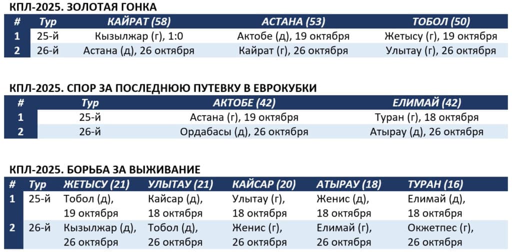 В оставшихся матчах «Актобе» с «Елимаем» поборются за последнюю вакансию в еврокубках. В нижней части таблицы пять клубов определят одного лишнего в борьбе за выживание в элите.