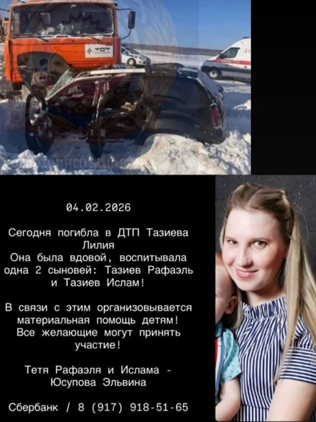 4 февраль көнне килеп чыккан юл фаҗигасе Әлмәт районы Тайсуган авылында яшәгән Лилия Таҗиеваның гомерен өзә. Лилия, нибары 31 яшендә, ике кечкенә баласын ятим калдырып, якты дөнья белән хушлашкан. «Интертат» мәрхүмәнең якыннары белән аралашты.