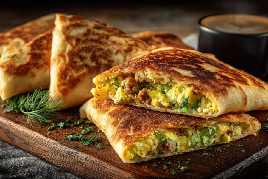 Для начинки обжарьте лук-порей с колбасой, добавьте взбитые яйца и зелень, доведите до готовности. Выложите начинку на блинчики, посыпьте сыром, сложите пирожками. Подавайте горячими — это завтрак, от которого невозможно оторваться.