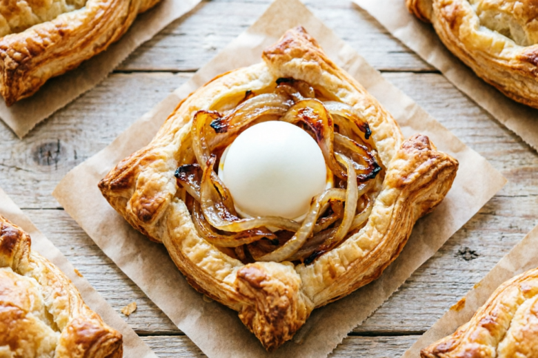 Тесто раскатайте и нарежьте на квадраты. В центр каждого выложите ложку лука, сверху — половинку яйца срезом вниз. Аккуратно соберите края, формируя «мешочек». Переложите заготовки на противень, смажьте взбитым яйцом и выпекайте при 180–200 °C около 20–25 минут.