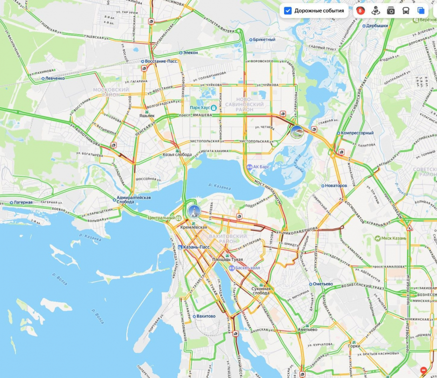 Из-за метели сегодня вечером в час-пик Казань втала в 8-балльных пробках. Об этом свидетельствуют данные сервиса «Яндекс Карты».