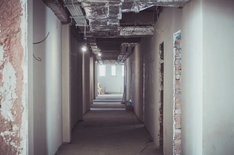 Демонтажные работы в школе завершены более чем на 80%. Сейчас ведётся ремонт фасада и кровли, замена окон и дверей, модернизация систем электро и водоснабжения, канализации, отопления и другие работы.