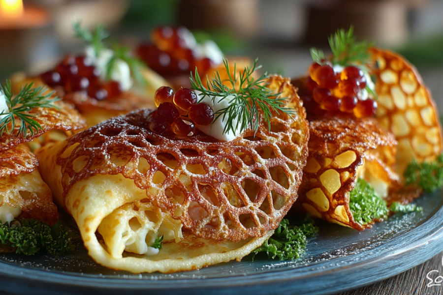 Беру кефир, яйца и муку — и через 15 минут на столе ажурные блинчики-сеточки, которые превращаются в эффектную закуску. Это гениально простое и невероятно вкусное блюдо, идеальное для праздничного стола или уютного ужина, когда хочется удивить гостей необычной подачей.