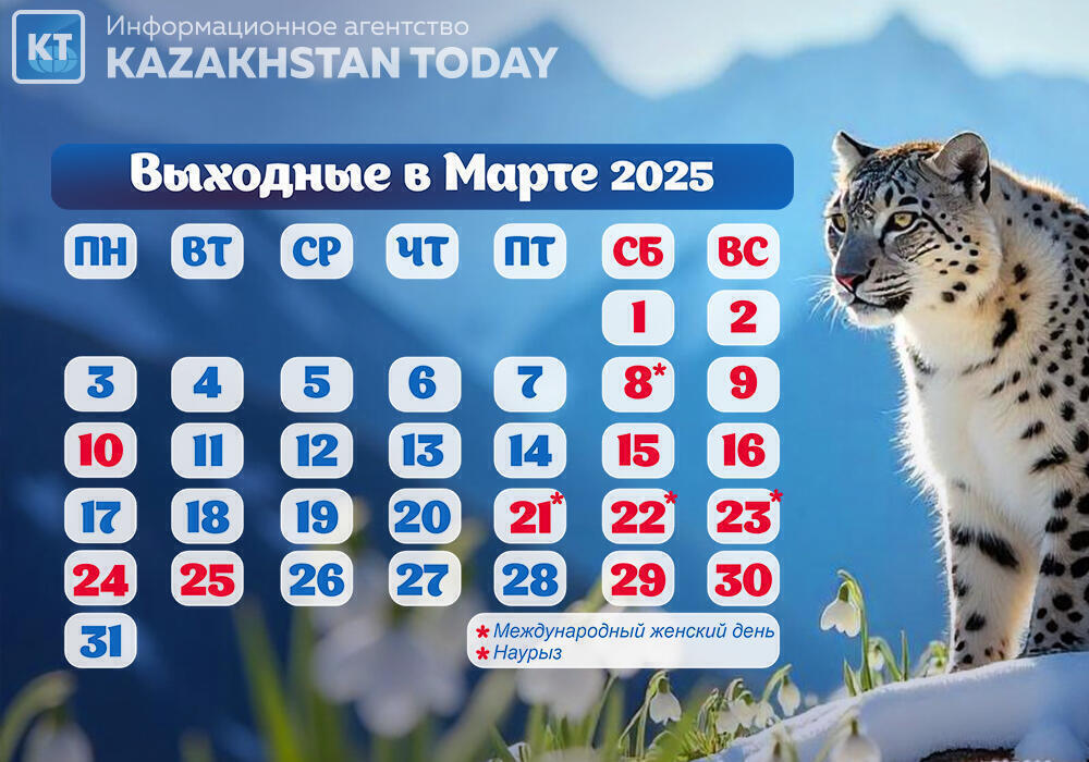 Всего в марте казахстанцев, работающих пять дней в неделю, ждёт 14 выходных и 17 рабочих дней.
